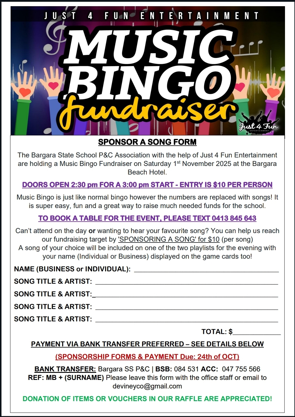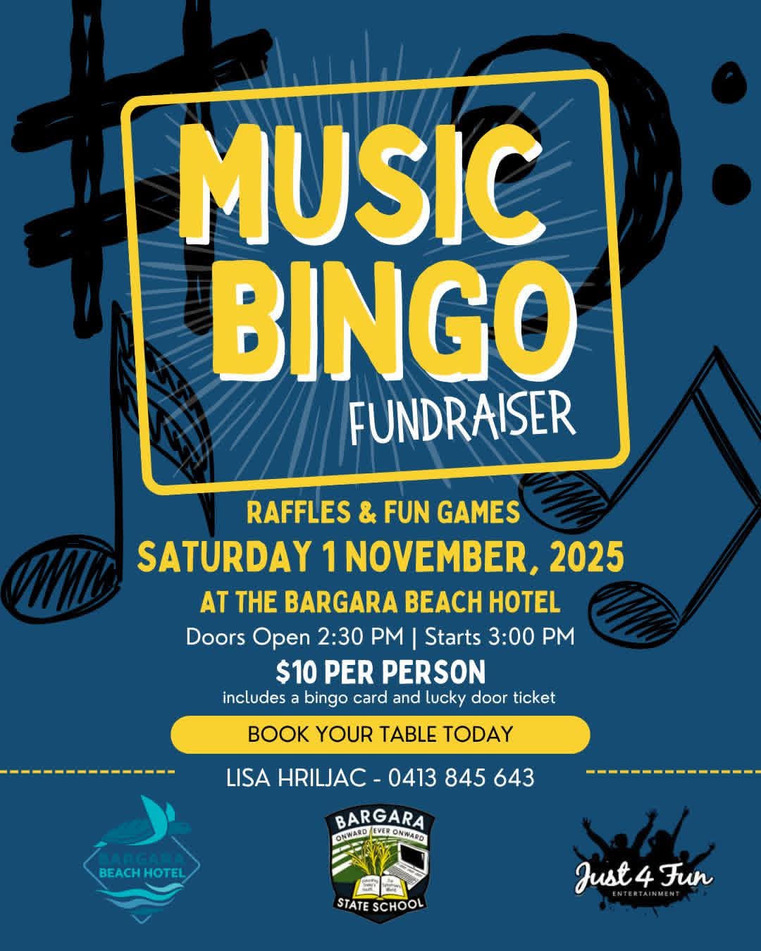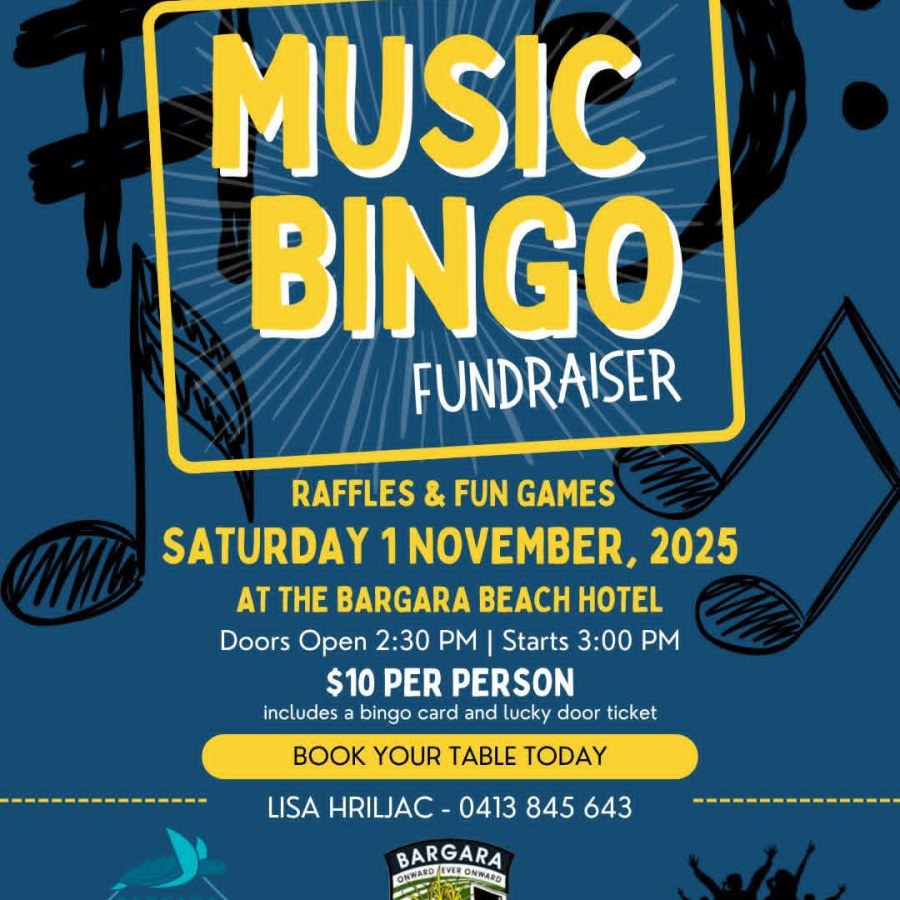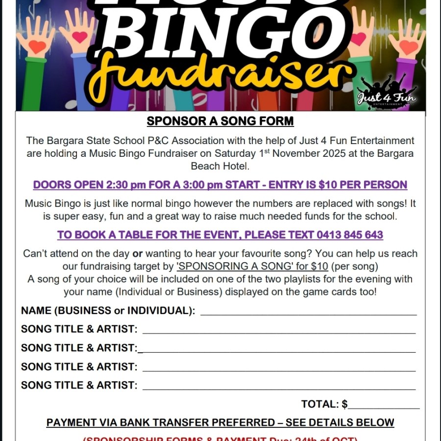 The Bargara State School P&C Association with the help of Just 4 Fun Entertainment are holding a Music Bingo Fundraiser on SATURDAY 1ST OF NOVEMBER 2025 at the Bargara Beach Hotel. Doors Open 2:30PM for a 3:00PM Start. Entry $10.00 person includes bingo card and lucky door ticket. There will be raffles and a money board too! The café will be serving all day dining meaning toasties, sausage rolls, pizzas, cakes, coffee and more are available for you to order throughout the afternoon. To book a table for the event, sponsor songs or donate a prize for the raffle – please contact Lisa 0413 845 643