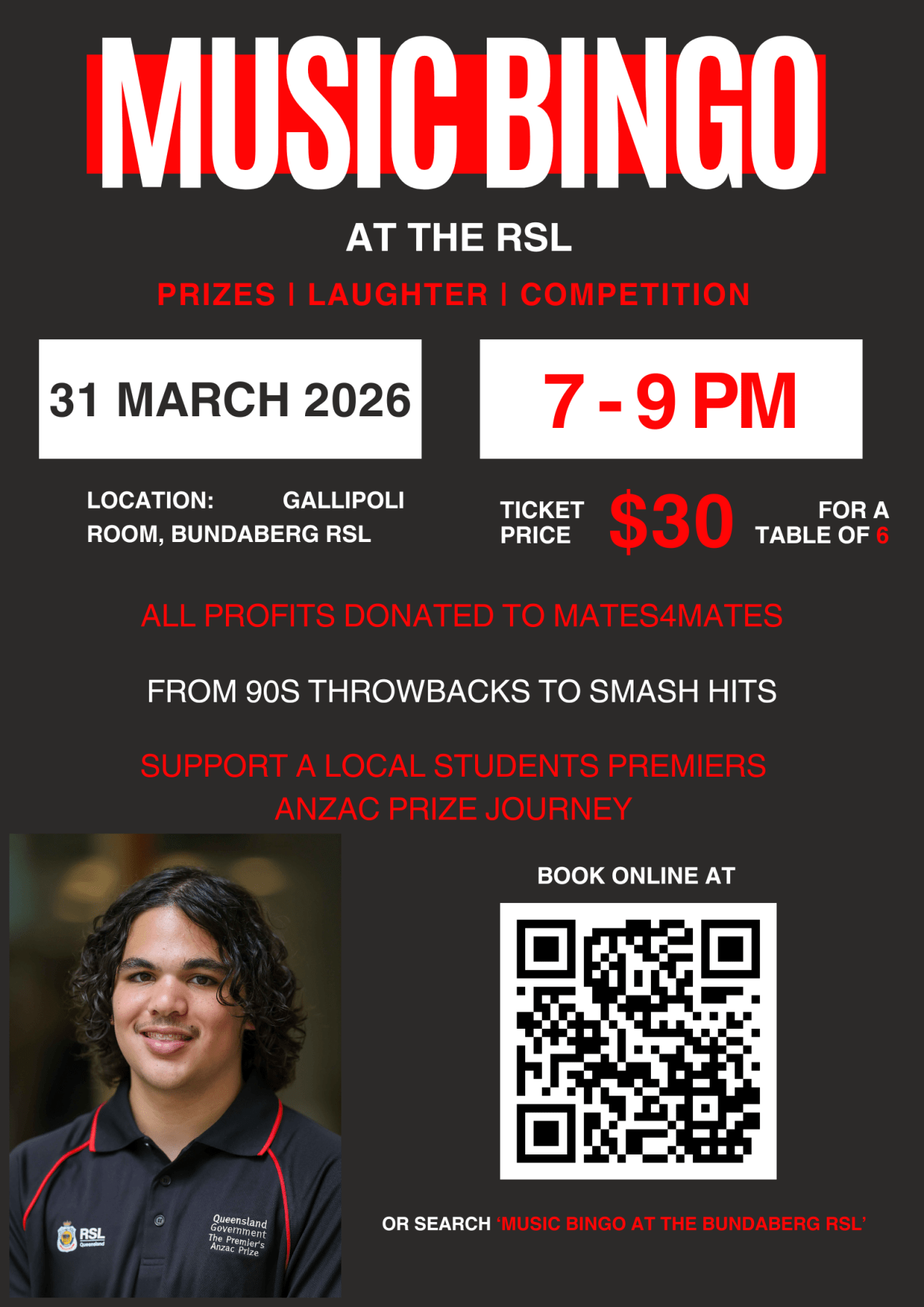 Music Bingo at the RSL is a fundraiser for Mates4Mates. This supports local student, Seth Johnson, as he travels to Europe as part of the Premiers ANZAC Prize. Mates4Mates and the support of RSL Queensland, is committed to providing support to current and ex-serving Defence Force members and families experiencing the impacts of service. They provide a way forward for those experiencing service-related physical injuries, mental health concerns and social disconnection. Premier’s ANZAC Prize awards 8 Queensland students to travel over to Europe to commemorate soldiers. The process is academic intensive, having to research historical military documents, present a eulogy abroad, and also privileged to attend dawn service at the Australian War Memorial at Villers-Bretonneux. Join a family friendly night of music bingo. From 90’s hits to smashes from the last decade, where prizes are to be won throughout the night!
