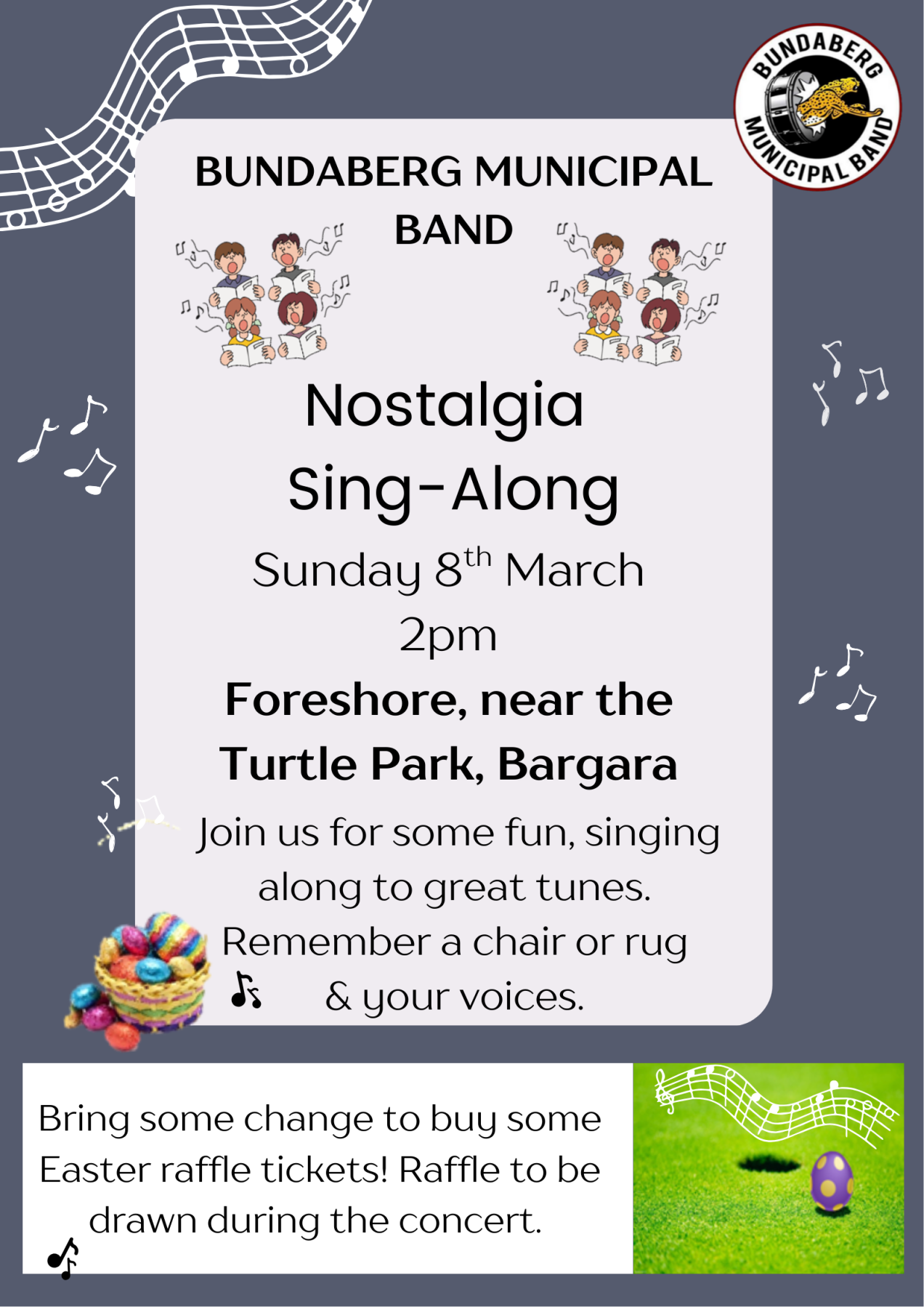 Sunday, 8th March at 2pm, the Bundaberg Municipal Band will be having their first, free community concert of the year. A great afternoon of music on the Foreshore, near the Turtle Park, at Bargara. Bring a chair or rug, family and friends and perhaps some snacks and drinks. A fabulous afternoon of music to sit back and enjoy the tunes, or join in with some singing. With Easter just around the corner, bring some change for the Easter Raffle!