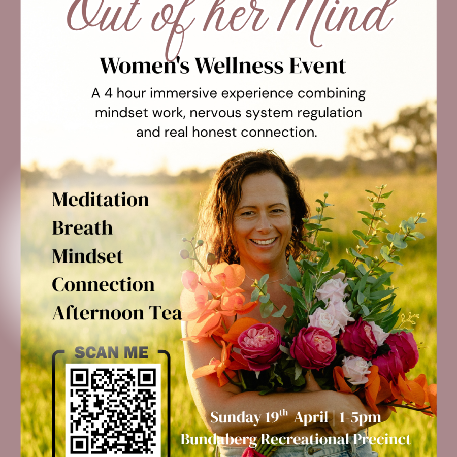 Out of Her Mind is a quarterly women’s wellbeing event held in Bundaberg, with each event offering a unique experience. The next event being next Sunday 19th April 1-5pm. Designed for women who feel overwhelmed, stuck in their thoughts are high-functioning and living in autopilot, or those who seem “fine” but know they want more. This 4-hour experience offers mindset tools, breathwork, meditation and connection in a supportive group setting, with an amazing afternoon tea. A space to slow down, reconnect, and remember who you are. Because women don’t heal alone, we heal in the reflections of each other.